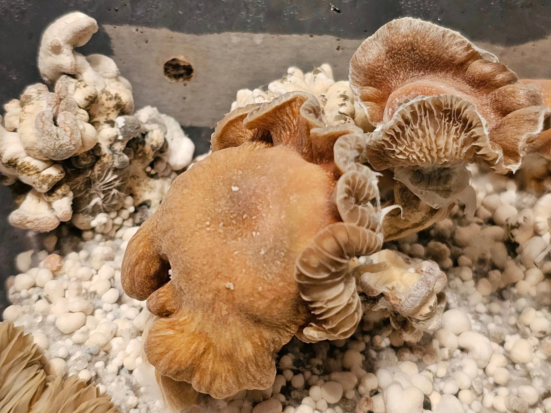 The next grow seemed to be following the same path towards a brain coral type growth, and in my excitement, I sent out a number of the cultures to people labeled "Chocolate Gumby Brains". Then to my surprise, the brain like growths began to grow cap parts with gills and spores, and a few very slow growing mushrooms began to grow as well.